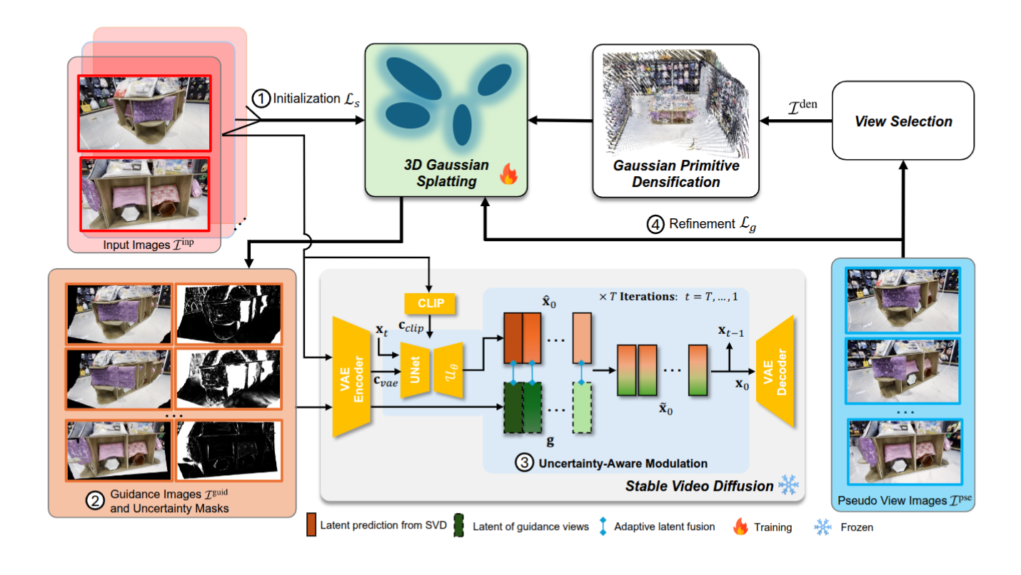 Overview of the framework. After initializing 3D-GS from sparse input images (①), ② we create guidance images and assess their uncertainties based on the current 3D-GS renderings. ③ The guidance images guide the diffusion process through the uncertainty-aware modulation. The diffusion process enhances high-uncertain regions while preserving reliable parts. ④ The generated pseudo-view images are then used to densify the Gaussian primitives and to constrain the 3D-GS training. For illustration, we show pseudo-view generation from one image pair, though all pairs are processed sequentially in practice.